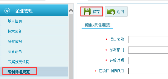第六步:點(diǎn)擊編制標(biāo)準(zhǔn)規(guī)范模塊,點(diǎn)擊添加按鈕填寫相關(guān)信息,填寫完成后點(diǎn)擊保存,如圖6-1-8: