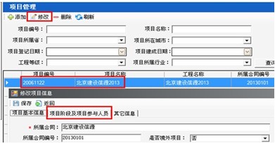 第一步:點(diǎn)擊“合同及項(xiàng)目管理-勘察設(shè)計(jì)項(xiàng)目管理”模塊,選中項(xiàng)目點(diǎn)擊修改,在修改界面填寫項(xiàng)目階段,如圖21-8-2: