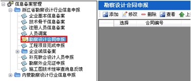1、點擊“信息備案管理—浙江省勘察設(shè)計行業(yè)信息申報—勘察設(shè)計合同申報”模塊,顯示勘察設(shè)計合同申報界面(如下圖21-4-1):