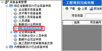 1、點擊“信息備案管理—浙江省勘察設(shè)計行業(yè)信息申報—工程項目完成申報”模塊,顯示工程項目申報界面(如下圖21-4-3):