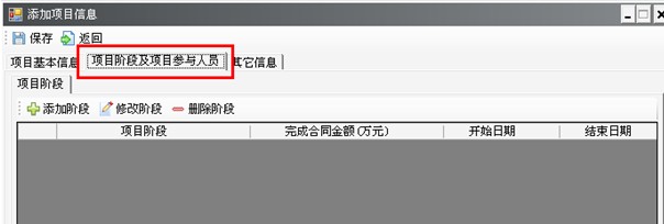 第三步:錄入合同及項目信息。點擊“合同及項目管理”按鈕,則會出現(xiàn)子功能模塊(如圖20-5),依次點擊進入子功能模塊填寫頁面進行填寫。所有帶紅色星號都是必填項,“勘察設計項目管理”中的“項目階段”(如圖20-6)必須填寫,不填,申報材料時將無法顯示正確的企業(yè)業(yè)績信息。