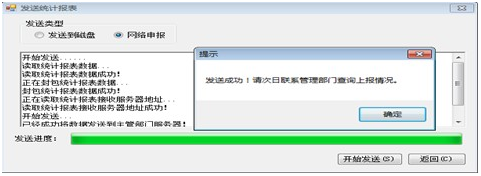 2、點擊“是”彈出統(tǒng)計年報表發(fā)送界面,發(fā)送類型選擇“網(wǎng)絡(luò)發(fā)送”,點擊“開始發(fā)送”按鈕。如需要電子版,可以選擇“發(fā)送到磁盤”生成一個數(shù)據(jù)包(如圖20-18):