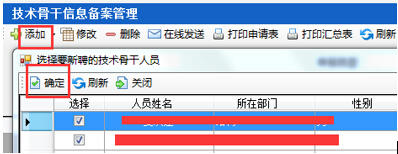 第三步:點(diǎn)擊“添加--新聘人員”,彈出人員選擇列表,將需要備案的技術(shù)人員進(jìn)行勾選,點(diǎn)擊“確定”,如圖29-2-3: