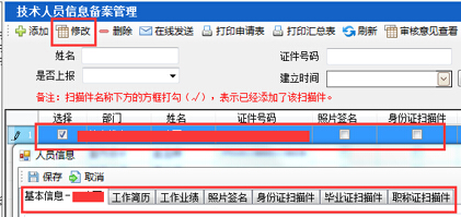 第四步:選擇人員后回到技術(shù)人員信息備案界面,選中人員點(diǎn)擊菜單欄“修改”,彈出該人員信息對(duì)話框,完善基本信息、工作簡歷、工作業(yè)績等內(nèi)容,如圖29-2-4: