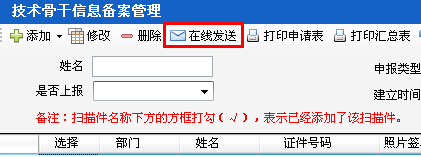 第七步:完善人員信息后,在技術(shù)人員信息備案界面,勾選完善后的人員信息,點(diǎn)擊“在線發(fā)送”按鈕,完成技術(shù)人員信息備案,如圖29-2-7: