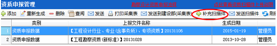 1、生成完資質(zhì)申請(qǐng)表后,點(diǎn)擊“補(bǔ)充掃描件”按鈕,如圖27-2-1: