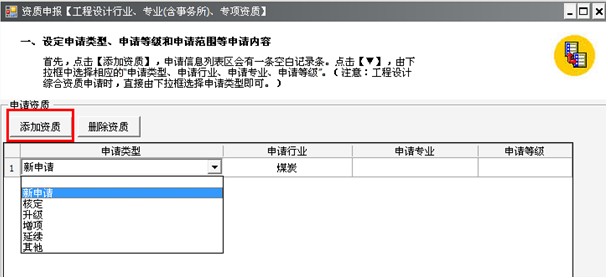 4、點(diǎn)擊“下一步”,進(jìn)入“設(shè)定申請類型、申請等級和申請范圍等申請內(nèi)容”設(shè)置的窗口,點(diǎn)擊“添加資質(zhì)”,選擇下方的申請類型、申請行業(yè)等字段(如圖20-24):