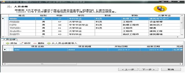 7、選擇人員后點(diǎn)擊下一步,顯示人員業(yè)績選擇界面。點(diǎn)擊“添加”或者“從人員業(yè)績里導(dǎo)入”添加要上報的人員業(yè)績(如圖20-28):