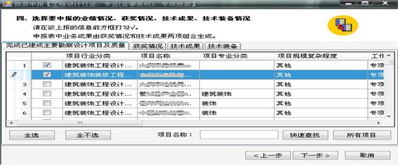 8、點(diǎn)擊下一步,選擇要申報的業(yè)績情況、獲獎情況、技術(shù)成果、技術(shù)裝備情況,在欲上報的信息前打鉤(如圖20-29):