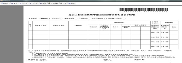 7、點(diǎn)擊“查閱”,彈出“資質(zhì)上報文件查閱”窗口,點(diǎn)擊“打印業(yè)績核查表”按鈕,彈出打印業(yè)績核查表打印預(yù)覽,點(diǎn)擊“打印”按鈕即可(圖20-36):