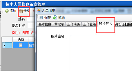 第二步:選擇人員,點(diǎn)擊“修改”,彈出人員信息補(bǔ)充界面,選擇“照片簽名”分欄,進(jìn)行照片簽名的添加。如圖28-8-2: