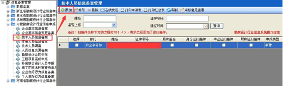 第二步:點擊“信息備案管理”→“內(nèi)蒙勘察設(shè)計行業(yè)信息申報”→“技術(shù)人員信息備案”,彈出“技術(shù)人員信息備案管理”界面,如圖28-2-2: