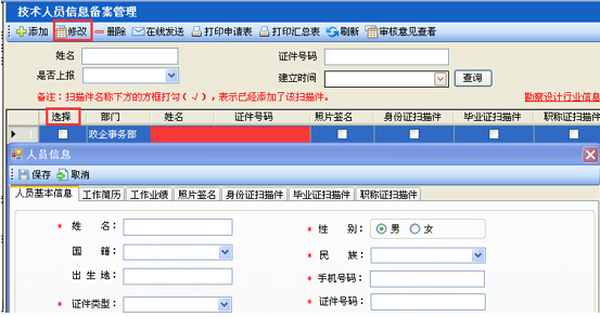 第四步:選擇人員后返回到“技術(shù)人員信息備案管理”界面,勾選中人員后,點擊菜單欄“修改”,彈出該人員信息的對話框,可對該人員的基本信息、工作簡歷、工作業(yè)績等內(nèi)容進(jìn)行修改、補(bǔ)充、完善,如圖28-2-4: