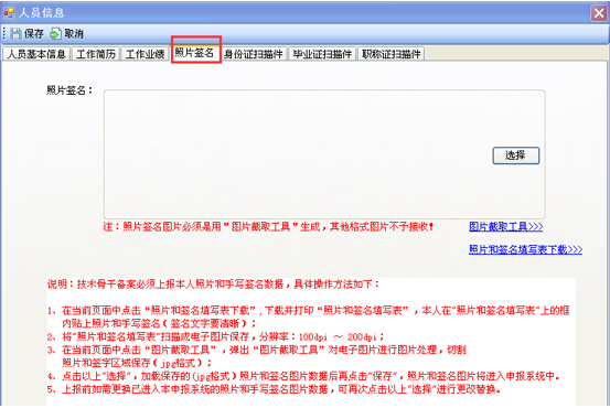 第六步:分別點擊“身份證掃描件”、“畢業(yè)證掃描件”、“職稱掃描件”分欄,按要求選擇相關(guān)的掃描件,然后點擊“保存”,如圖28-2-6: