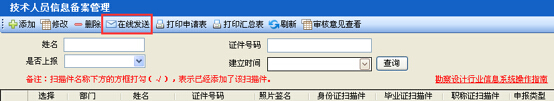 第七步:補(bǔ)充、完善人員信息后,在“技術(shù)人員信息備案管理”界面,勾選修改、完善后的人員信息,點擊“在線發(fā)送”按鈕,即完成技術(shù)人員信息備案,如圖28-2-7: