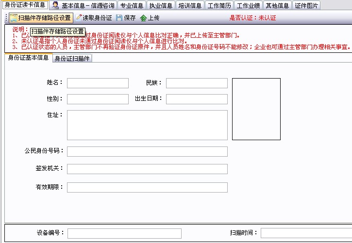 第三步:把要掃描的身份證放在閱讀儀的掃描區(qū)域上,點擊讀取身份證,讀取身份證信息后單擊保存。(如圖1-3,1-4)
