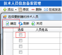 第三步:點(diǎn)擊“添加--新聘人員”,彈出人員選擇列表,將需要備案的技術(shù)人員進(jìn)行勾選,點(diǎn)擊“確定”,如圖24-2-3: