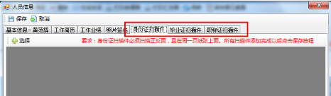 第六步:點(diǎn)擊“身份證掃描件”、“畢業(yè)證掃描件”、“職稱掃描件”分欄,分別對(duì)相關(guān)掃描件進(jìn)行選擇,然后點(diǎn)擊“保存”,如圖24-2-6:
