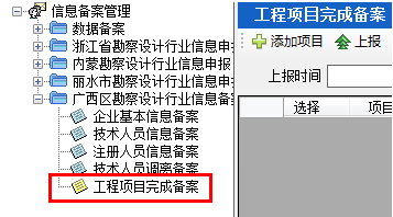 第一步:點(diǎn)擊“信息備案管理—廣西區(qū)勘察設(shè)計(jì)行業(yè)信息備案—工程項(xiàng)目完成備案”模塊,顯示工程項(xiàng)目完成備案(如下圖24-4-1):