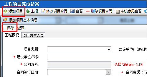 第二步:點(diǎn)擊“添加項(xiàng)目”按鈕,彈出添加項(xiàng)目基本信息的對話框,完善工程概況、項(xiàng)目參與人員后,點(diǎn)擊“保存”按鈕(如下圖24-4-2):