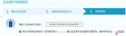 點(diǎn)擊“通過身份識別鎖找回”進(jìn)入頁面后點(diǎn)擊“檢測身份識別鎖有效性并獲取新密碼”,如身份識別鎖驗證有效,會顯示新的密碼。如圖1-4-4