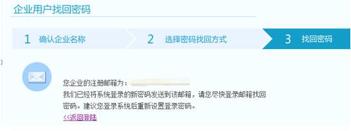 點(diǎn)擊“通過注冊郵箱找回”,系統(tǒng)會提示企業(yè)的注冊郵箱地址,并將密碼發(fā)至該郵箱中,企業(yè)登錄郵箱即可查看新密碼。如圖:1-4-5