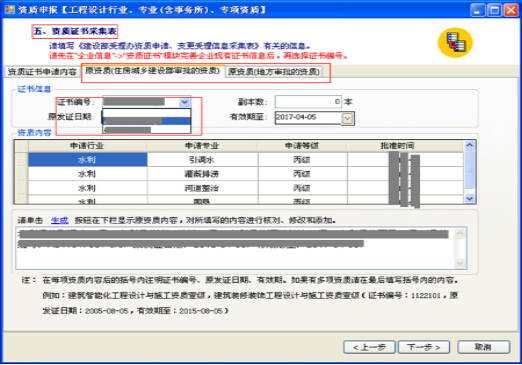 第二步:根據(jù)提示點(diǎn)擊下一步,一直到“五、資質(zhì)證書(shū)采集表”-點(diǎn)擊“原資質(zhì)(住房城鄉(xiāng)建設(shè)部審批的資質(zhì))或“原資質(zhì)(地方審批的資質(zhì))”將信息完善(如圖7-27):