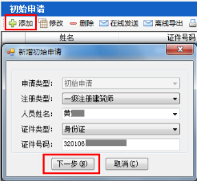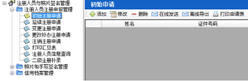 第三步: 點(diǎn)擊“注冊(cè)人員與照片簽名管理-注冊(cè)人員注冊(cè)申報(bào)管理-初始注冊(cè)申請(qǐng)”按鈕,右側(cè)顯示初始注冊(cè)申請(qǐng)界面(如圖12-9-1):
