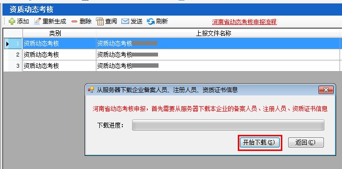 2、點(diǎn)擊“添加”,彈出“從服務(wù)器下載企業(yè)備案人員、注冊(cè)人員、資質(zhì)證書信息”窗口,點(diǎn)擊開始下載按鈕。