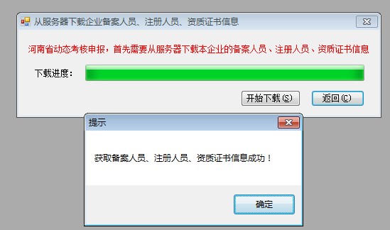 3、系統(tǒng)自動(dòng)從服務(wù)器中下載企業(yè)基本信息及人員信息(數(shù)據(jù)來源:四庫一平臺(tái)申報(bào)信息),下載成功點(diǎn)擊確定。