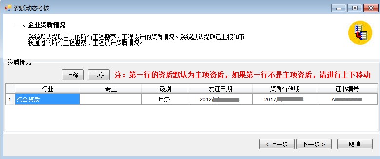 5、點(diǎn)擊“下一步”,進(jìn)入企業(yè)資質(zhì)情況窗口,企業(yè)資質(zhì)情況界面自動(dòng)提取證書打印系統(tǒng)中的資質(zhì)信息(數(shù)據(jù)來源:證書打印庫),資質(zhì)情況不允許修改,可以進(jìn)行上移、下移,第一條資質(zhì)默認(rèn)為主項(xiàng)資質(zhì)。