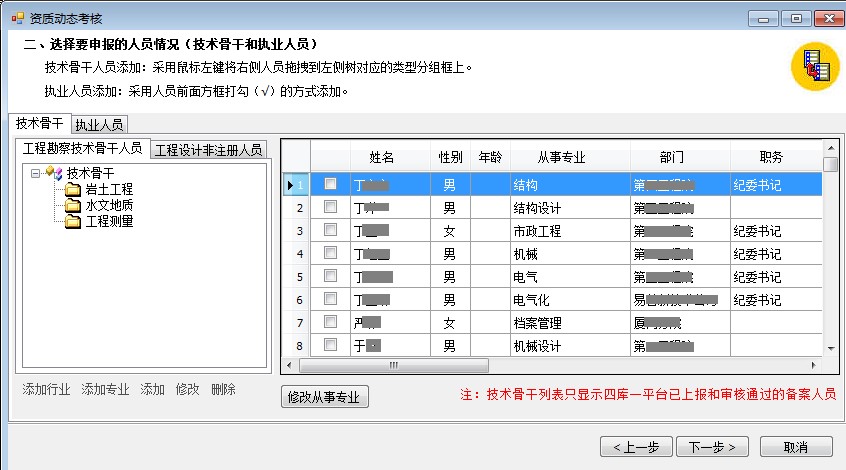 6、資質(zhì)信息下一步,彈出“選擇要申報(bào)的人員情況(技術(shù)骨干和執(zhí)業(yè)人員)”界面,技術(shù)骨干頁面人員列表中采取鼠標(biāo)左鍵拖拽方式,拖動(dòng)到左邊相應(yīng)的專業(yè)上面,執(zhí)業(yè)人員則進(jìn)行勾選方式選擇。