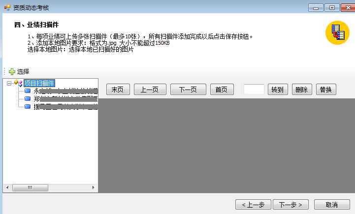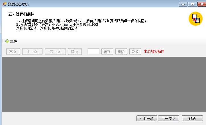 9、業(yè)績掃描件上傳完成后,點(diǎn)擊“下一步”,上傳社保證明,最多上傳30張掃描件。(注:掃描件上傳為一頁多條人員社保證明的掃描件信息)