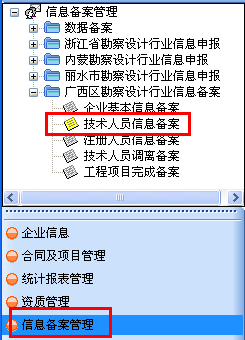 第一步:點擊“信息備案管理—廣西區(qū)勘察設(shè)計行業(yè)信息備案—技術(shù)人員信息備案”,如圖24-7-1: