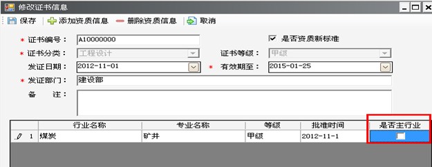第二步:選中主行業(yè)資質證書后,點擊“修改”按鈕,彈出資質證書界面(如圖6-2):