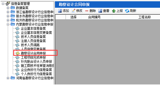 第一步:點(diǎn)擊“信息備案管理-內(nèi)蒙勘察設(shè)計(jì)行業(yè)信息申報(bào)-勘察設(shè)計(jì)合同申報(bào)”模塊,顯示勘察設(shè)計(jì)合同申報(bào)界面,如圖28-4-1: