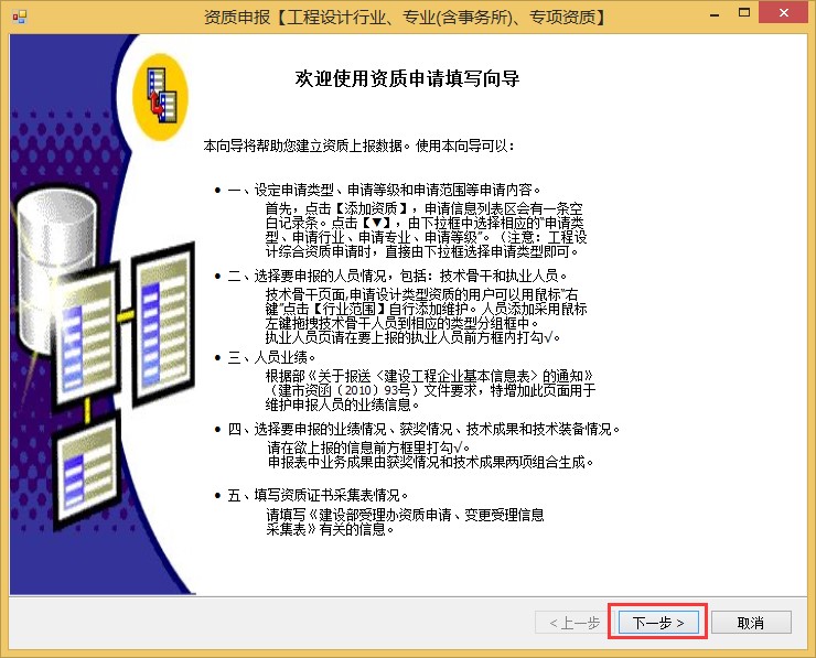 3、點擊“確定”進入資質申報向導,點擊下一步。