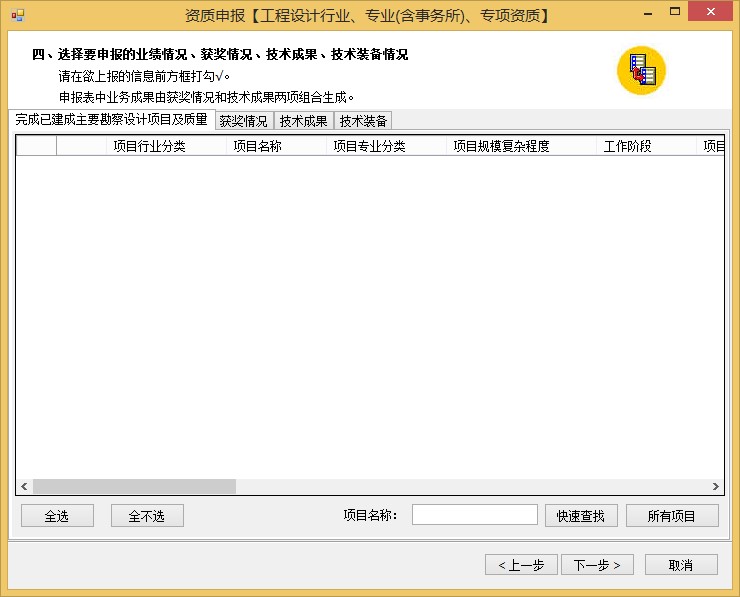 7、選擇要申報的業(yè)績情況、獲獎情況、技術成果、技術裝備情況界面,此次為簡單換證