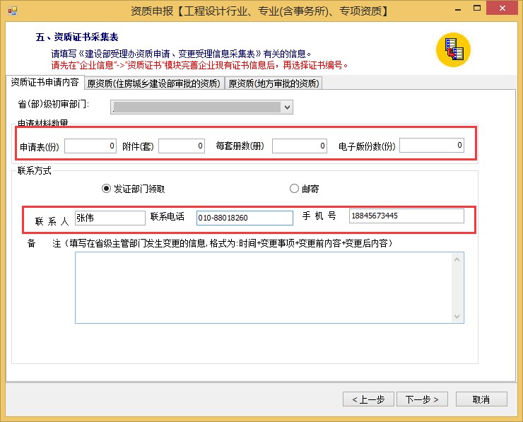 8、資質證書采集表。申請材料數(shù)量默認為0即可;聯(lián)系方式填寫領證人員姓名及聯(lián)系方式