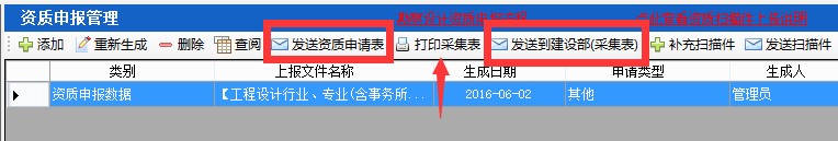 10、點擊“發(fā)送到建設部(采集表)”和“發(fā)送資質申請表”,發(fā)送成功后打印出帶條形碼的信息采集表即可。