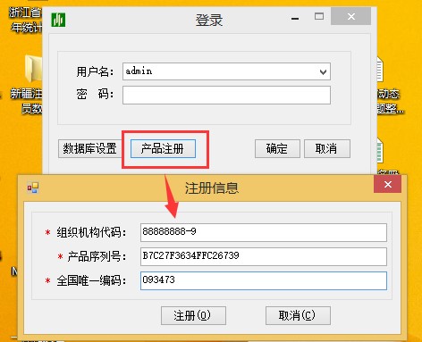 打開系統(tǒng)登陸界面,首次登陸應先進行產(chǎn)品注冊,將組織機構代碼、唯一碼、產(chǎn)品序列號添加到注冊信息中點擊注冊。
