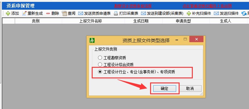 2、點擊“添加”彈出選擇上報類型,選擇工程設計行業(yè)、專業(yè)(含事務所)、專項,如下圖:
