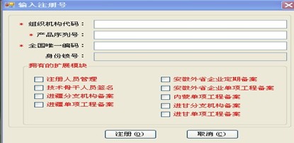 第三步:軟件注冊。成功登錄系統(tǒng)之后,則會自動彈出注冊頁面(如圖20-3),然后根據(jù)授權書中的信息,填寫組織機構代碼、產(chǎn)品序列號、全國唯一碼三個信息,填寫完成后點擊“注冊”按鈕即可注冊成功。