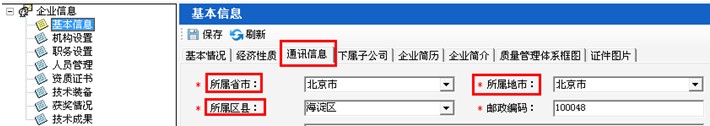 第二步:在企業(yè)信息-基本信息-通訊信息中把“所在省市、所在地市、所在區(qū)縣”重新選擇并保存(如圖12-7),然后點擊“更新服務(wù)器地址”按鈕(如圖12-8):