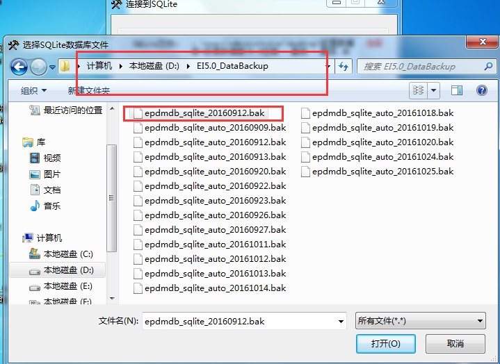 第一步:點(diǎn)擊確定,系統(tǒng)彈出選擇數(shù)據(jù)庫(kù)的界面,根據(jù)個(gè)人備份數(shù)據(jù)庫(kù)位置或者選擇D盤中EI5.0_DataBackup文件夾中的數(shù)據(jù)庫(kù),此文件夾中的數(shù)據(jù)庫(kù)圖為系統(tǒng)自動(dòng)存儲(chǔ)的數(shù)據(jù)庫(kù)。(1-6-1)